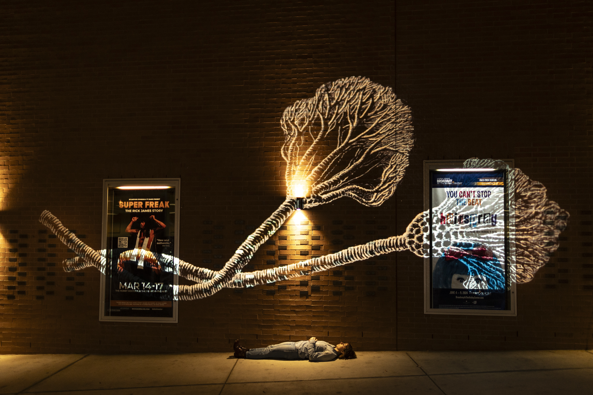 Artists Mark Chen and Colleen Maynard found overlapping interest in deep geological time and evolutionary layers, particularly the Permian-Triassic extinction of 251 million years ago that wiped out nearly 90% of living species at the time. A giant spectrum of plants, fish, amphibians, proto-mammals, arthropods and insects died; among them, trilobites remains became some of the most abundant fossils found globally today. Many other species took such significant hits that they were dethroned from thousands of years in the making. Colleen’s vivid drawings honor the extinct creatures into realized complexity. Mark takes calculated jaunts with his handmade projector to photograph the drawings upon surfaces ranging from mountain bluffs to architectural landmarks.